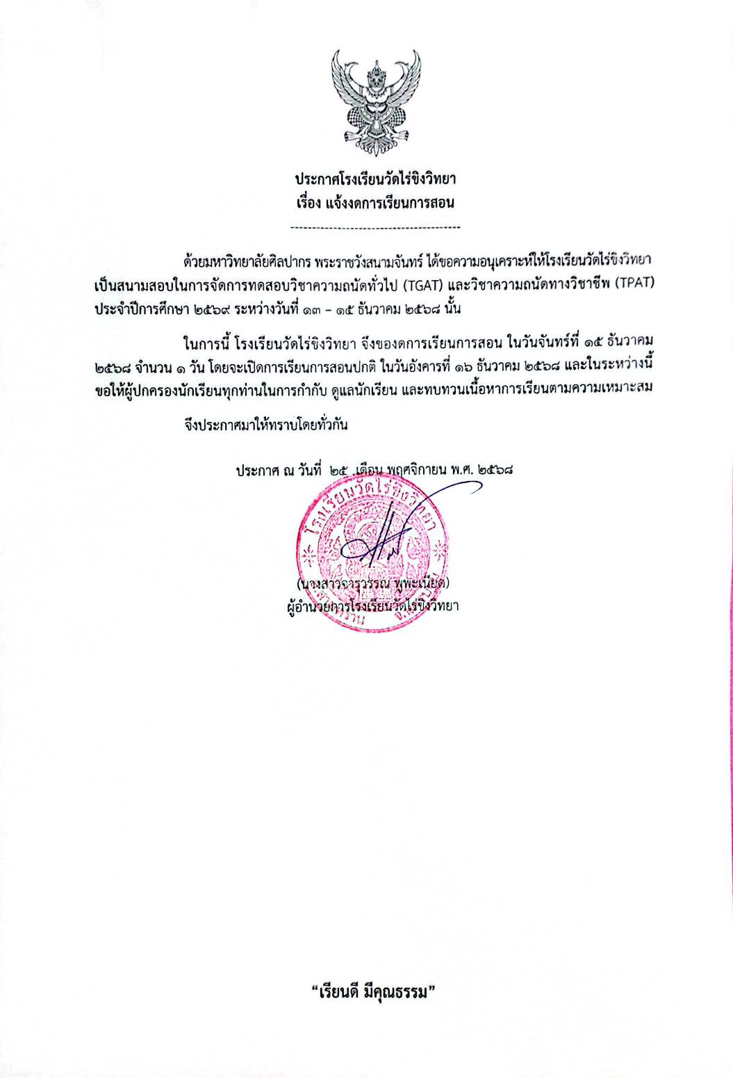ประกาศรายชื่อผู้ได้รับการคัดเลือกเป็นลูกจ้างชั่วคราวตำแหน่ง พีเลี้ยงเด็กพิการเรียนรวม (จ้างเหมาบริการ) โรงเรียนวัดไร่ขิงวิทยา ประจำปีงบประมาณ พ.ศ. ๒๕๖๙ 24 พ.ย. 68